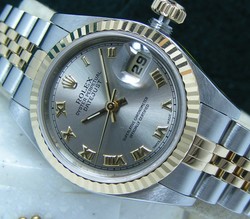 79173 Ladies DJ TT Factory Slate Roman Numeral Dial / Fluted Bezel #A73 Sold new on September 1st 2000, Purchased from the Original Owner, This watch has Rarely been worn, Newest "No Holes" case design, 100% Authentic & Original Rolex, We have the Authentic & Original Rolex Inner and Outer Boxes, DateJust & Factory Service Booklets, Warranty Sleeve, Wipe Cloth, Amber & full Serial Number Hang Tags and the Original Expired Warranty Paper for this watch. Rolex Serviced $10,995